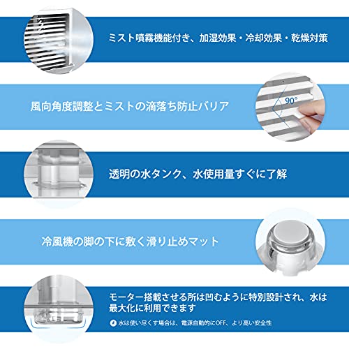 【1台3役・多機能噴霧冷風機】送風・冷却加湿・空気浄化の3つ機能を揃えている冷風機小型ミニクーラーです。普通の扇風機より、噴霧機能を追加、水が超音波で加工され、繊細なミストになります。超音波化されたミストで、扇風機の風と共に吹き出せ、涼しくても肌乾燥防止をできて、普通の扇風機の風より涼しい、加湿器より加湿範囲が広い、クーラーより寒くならない省エネです。猛暑対策の最高扇風機です。加湿効果・冷却効果・乾燥対策。子ども、女性やお年寄りなど、冷えに敏感な方におすすめします。ペットの暑対策も。