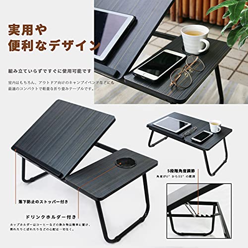 【2021年最新の5段階高さ&角度調節可能、カップホルダー付き】脚高さが12cm-18cm調節でき、天板の角度が0°から55°の範囲まで5段階に変換可能、落下防止のストッパー付き。自分楽な姿勢と好きな角度でノートパソコンやタブレットなど操作できて、デスクワークの肩凝りや疲労を和らげます。