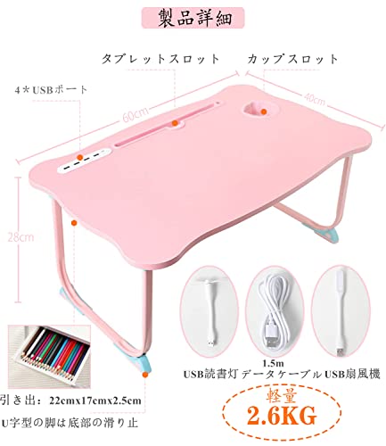 ? 【多機能折りたたみテーブル】USB読書灯とファンが付属しています、折りたたみテ ーブルには、4USBポート・タブレットスロット(最長辺の22CMを超えないタブレットに適用)があって、ラップトップ やスマホやタブレットに充電するのが便利です。ホームオフィスや寮の勉強に最適です。また、ミニ引き出しとカップス ロットもあります。