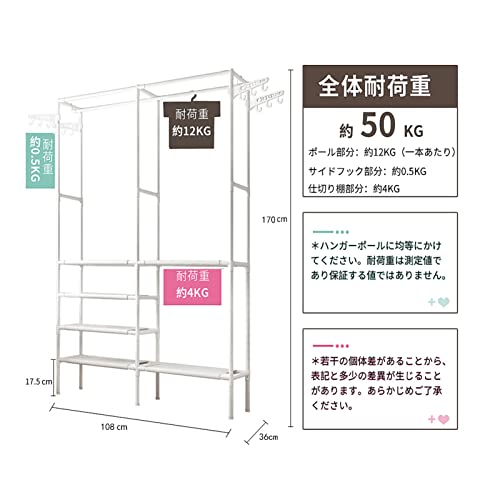 【しっかり耐荷重&安定性】BangLede洋服タンスは幅108×奥行36×高さ170cm。約3.03kg。高強度なスチールフレームと丈夫なPPパーツで組み合わせる頑丈なハンガーラックはしっかり安定しています。左右上部のポール耐荷重は各12KG、?耐荷重は50kgまで達しまています。たくさん物を置いでも歪みにくいです。4本足