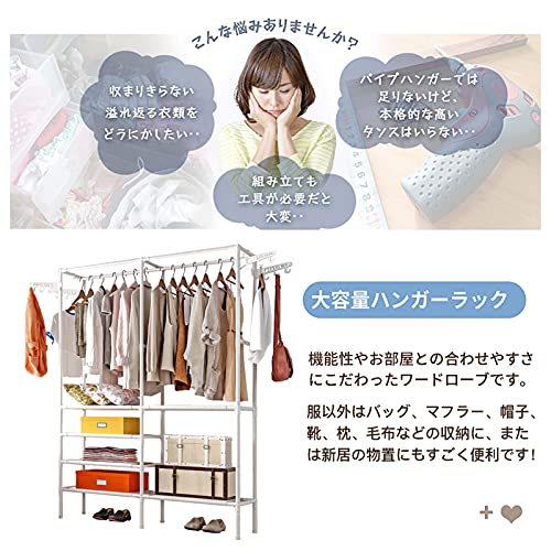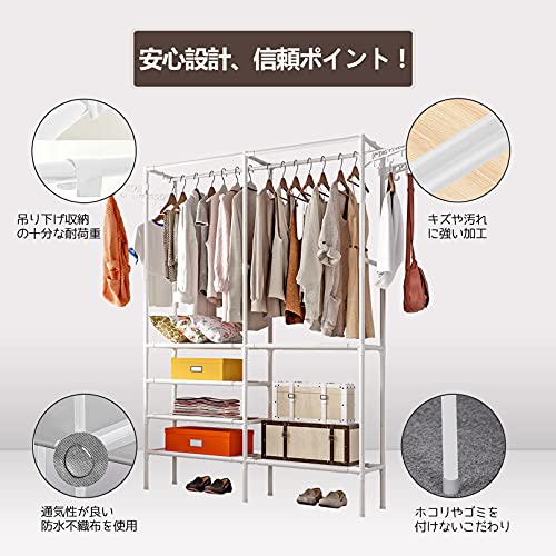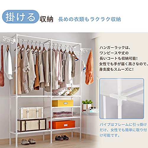 【大容量の収納スペース】2-in-1収納ソリューションと吊り下げ式ロッド洋服ラック。「掛ける収納」「置く収納」をバランスよく取り入れた使い勝手がよく、大量の洋服を上段にたっぷり掛けられで、下部に6ヶ棚を備えたシンプルながらしっかり収納できるハンガーラック。服以外はバッグ、マフラー、帽子、靴、枕、毛布などの収納に、または新居の物置にもすごく便利です!