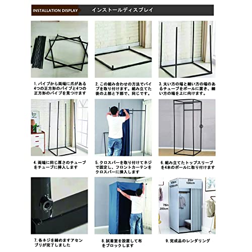 【パッケージの内容 】黒鉄フレーム(直径2.5cm)、グレー シェーディングクロス、金属製洋服フックアップ、組立付属品一式セット。全体のサイズは200x100x100cmに達し、3~4人を収容できる広いスペースがあります。カーテンが掛けやすく、グロメットがスムーズにスライドします。
