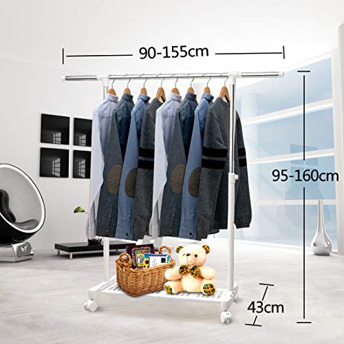 「縦横伸縮自由」高さは95-160cmまで、横には最大155cmまで、何回でもスラスラと調節できます!高めにしてワンピースやロングコート用に、 低めにして子供服になど、使い道に合わせて設置できます。ストッパーを下げるとフックがボールにガッチリと食い込めるので、洋服の出し入れはも安心です。