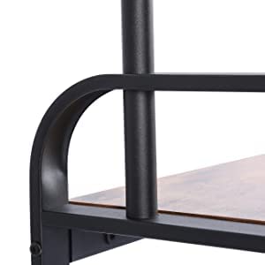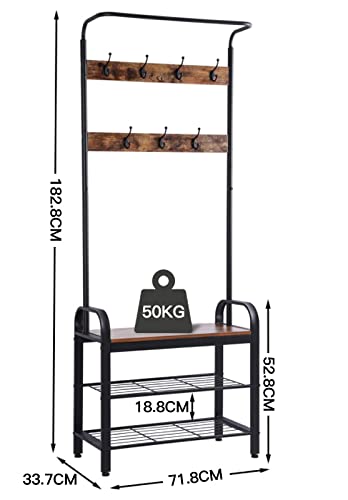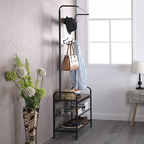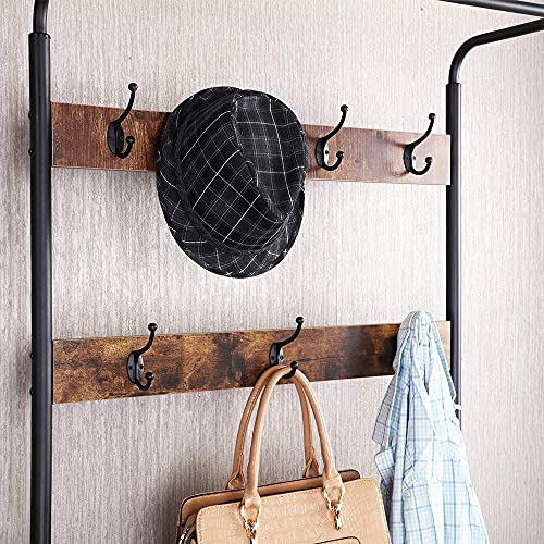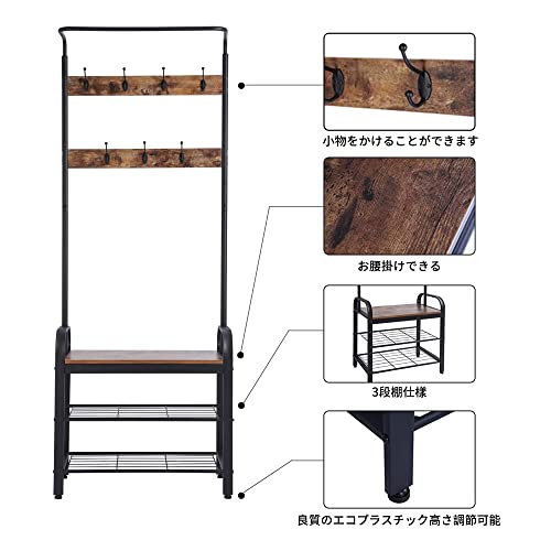 【完璧なデザイン】高品質の鉄棒と木目板を組み合わせることで、簡単に設置できるコートラック。固定式と可動式の2列のフックラックがあり、長尺物の高さ調節に便利です。子供や傘として;それはまた靴、バッグおよび他のアイテムのための3つの棚を含みます-一番上の棚は靴を履いている間座るのに十分安定しています。