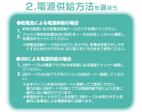 電源:USB (5V USB2.0 対応)、アルカリ単四型乾電池×4本可動式(別売)