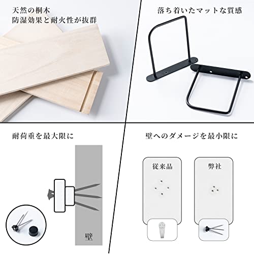 【温かみのあるおすすめな木製ウォールシェルフ】 棚板は天然の桐木を使用しており、無毒、退色せず、無塗装、ペンキの異臭がありません。人気の北欧風インテリア作りにおいて欠かせないアイテムです。 金属部分は、サビにくい「パウダーコーティング加工」を施しています、錆びにも強く、長い間使えます。暮らしを整えたい方、ぜひ壁収納家具棚をとりいれてみてください。