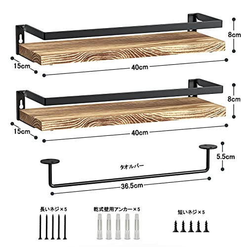 【商品仕様】おしゃれな壁掛け棚の2個セットです。ボードのサイズ:40×15×1.5cm (幅×奥行き×厚さ) ガードレールのサイズ:40×15×8cm (幅×奥行き×高さ) タオルバーのサイズ:36.5×5.5cm(幅×高さ) 素材:松材+鋳鉄 耐荷重:10kg