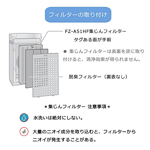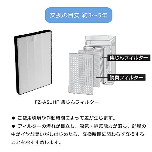 【交換の目安】FZ-A51HF交換用フィルターの交換目安は約3~5年ですが、ご使用環境や作動時間によって差が生じます。フィルターの汚れが目立ち、吸気・排気能力が落ち、部屋の中がイヤな臭いがしはじめたら、交換時期に関わらず交換することをおすすめします。