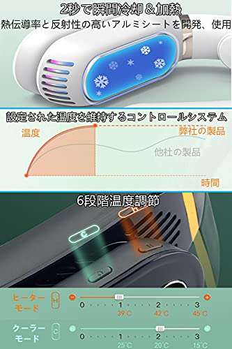 【2秒冷却&加熱・温度維持システム・6段階温度調節】ボタン1つで簡単に温冷切替を実現し、瞬間で効率的に冷却&加熱させることができます。半導体温度調節技術と温度維持システムにより、環境温度を察知し、体感温度を維持します。「COLD」ボタンを押すとクーラーモードになって3段階温度(約25[度]/20[度]/15[度])調節ができ、「HOT」