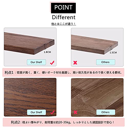 ?優れた素材? オーク木材で作られており、ナチュラルな素材感も魅力です。耐荷重は10-20kg。天然の木材を厳選し、とても硬く丈夫で、長く使える素材です。環境にやさしく健康的です。吸音ボード、土壁、しっくいなどのもろい壁は耐荷重に弱いからご遠慮ください。バッフル付いて収納物の落下防止もできます。