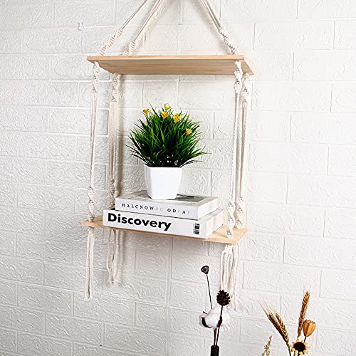 コットンのロープで吊るされたスイングシェルフは、ユニークで素朴な魅力を持っています。