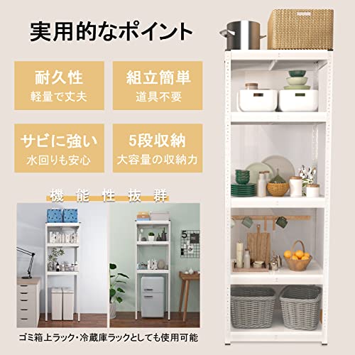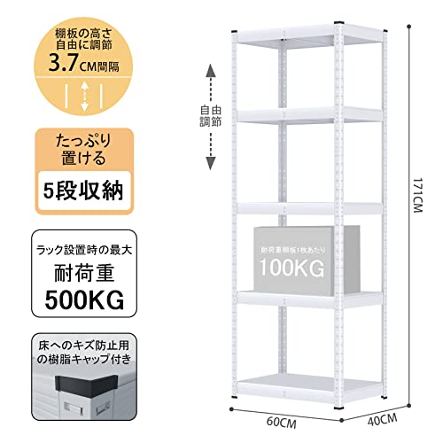 【商品仕様】サイズ(約):幅600×奥行400×高さ1600mm(組立時)。 重量(約):13kg。 耐荷重(約):(全体)500kg/(棚板1枚あたり)100kg。 付属棚板:5枚(段) 積載空間数:4。 お客様組立品。 また4段・5段タイプで多彩なサイズを用意しております。