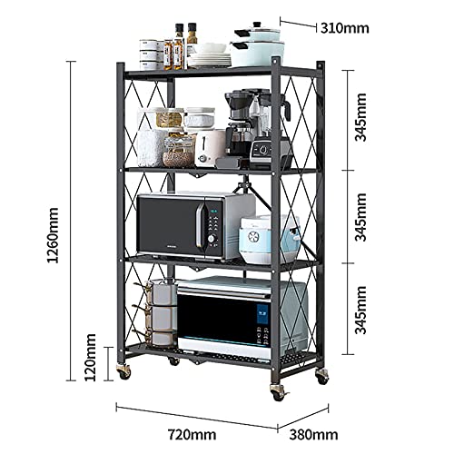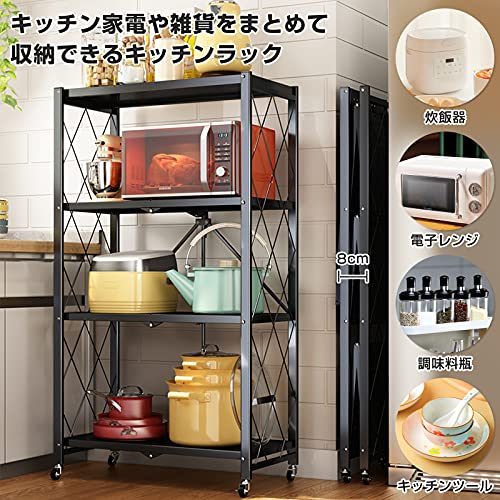 【4段折りたたみラック】キッチンラックは折りたたみ可能なデザインで、組み立ては非常に簡単、使えたくない場合は折りたたんで隙間で置くことが可能です。4段で収納量はたっぷりです。キッチン家電や、調味料、調理器具、食材などをすっきり整理できます。