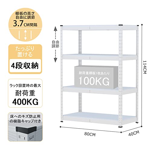 BoomoBoomo 軽量 スチールラック 幅80×奥行40×高さ114cm 4段 耐荷重100kg/段 高さ調節可能 スチール棚 組立簡単 収納