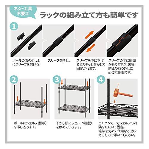 お部屋の雰囲気に合わせて選べるブラックカラーのスチールラック。ネジ・釘を使わないので女性でも楽々組立てできます。さらにガタツキを抑えるアジャスターで脚の微調整も可能で、とっても便利です。