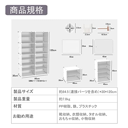 「製品規格/素材」サイズ:幅84.5(連接パーツを含め)奥行31高さ122cm。 両側用パネルサイズ:幅30高さ30c/長方形パネルサイズ:幅40高さ30cm/ドアサイズ:幅40高さ30cm。素材:PP樹脂、鉄、プラスチック。