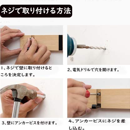 【付属品とサイズ】セット内容:接着剤、ビス、アンカービス。材質:竹集成材、フック:アルミ