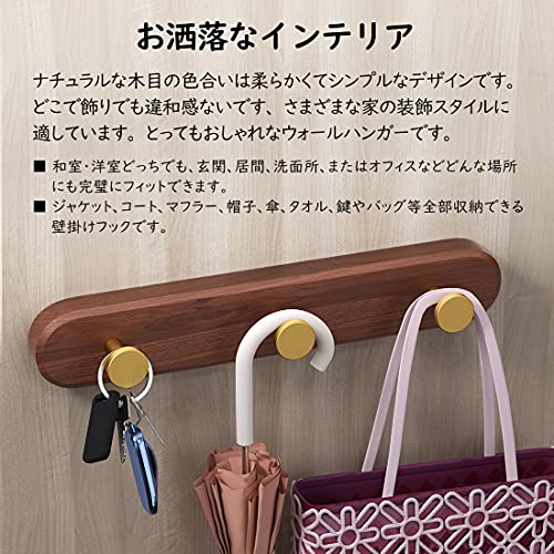 【お洒落なインテリア】ベースはアメリカのクルミ木材を採用し、ラックは高品質の真鍮素材で製造られています。フックがビスを隠して、ナチュラルな木目の色合いも柔らかくてシンプルなデザインです。どこで飾りでも違和感ないです、さまざまな家の装飾スタイルに適しています。とってもおしゃれなウォールハンガーです。