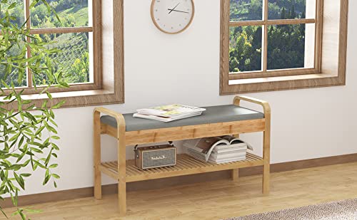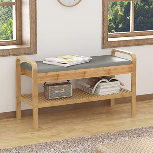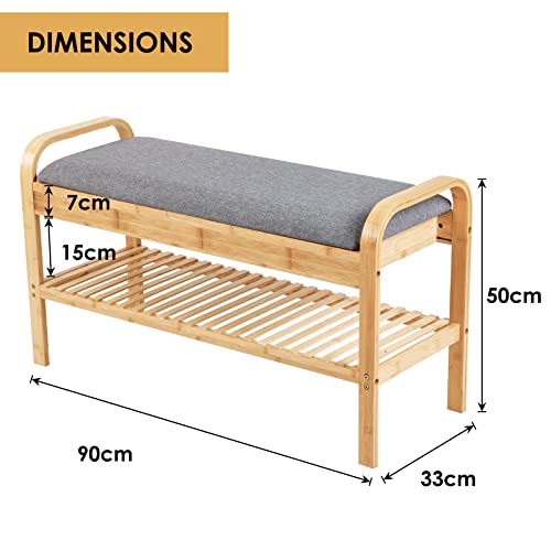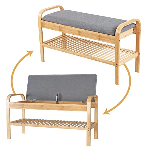 Soges 玄関ベンチ シューズラック 靴 収納 竹製 幅90×奥行33×高さ50cm 可動棚 天板開閉式 玄関収納 玄関 腰掛け