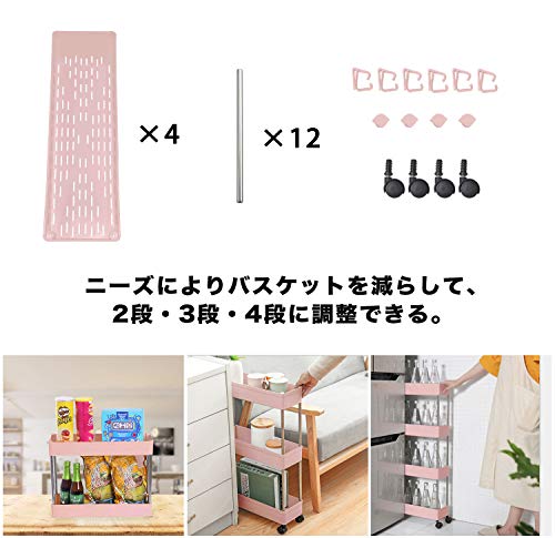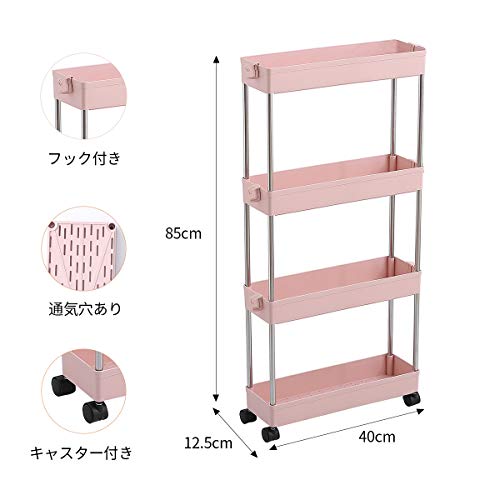 【商品仕様】使用サイズ:約幅13×奥行40×高さ85cm 500mlのペットボトルの収納:1段につき、7~10本収納可能です。素材はプラスチックで、軽くて移動しやすいのがメリットですが、安定性に欠けるのがデメリットなので、安定性を高めるために洗濯洗剤などの重いものを下の層に置くことをおすすめします。 耐荷重:約10kg ニーズによりバスケットを減らして、段数を自由に決めて、一段~四段まで使えます。 色は:ブラック、ホワイト、ピンクがあり、好みに応じて色を選ぶことができます。 素材:ステンレススチール+ABS。高級な材質は採用なので、防錆性、耐久性、安定性が高いです。