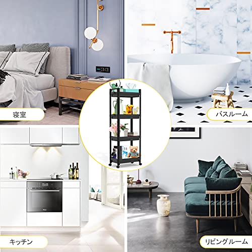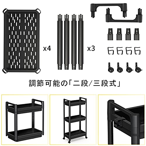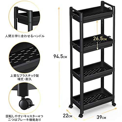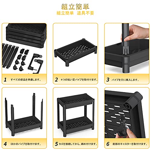 【移動も収納も便利】360度回転式キャスターです。その中の二つはブレーキ機能があり、静止状態を保つ可能です。一番上のカゴに取っ手付き、ワゴンの移動をもっと便利に