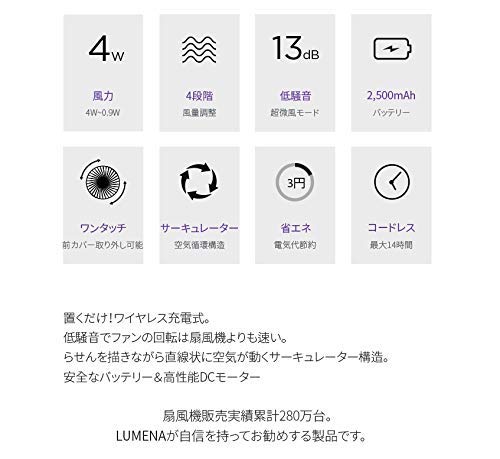・コードレス・コンパクトに持ち運びできる ・1回のフル充電で最大14時間使用可能 ・充電器に置くだけでコードレス充電できる ・2500mAhのバッテリー内蔵 ・13dBの低騒音、DCモーターで静音設計