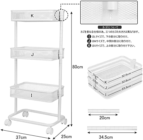 ? 高さ調節機能付き、二段・三段変換可能 ? 付属のスリーブでカゴの高さを調節ので、収納する物に合わせることができる自由に調節できます。柱が二分割なり、上段や下段を抜き、一段にして利用可能、高さは80.5cm・60.5cm・46.5cmに変換することができます。カゴを二段にすると、サイドテーブル替わりに使用できます。いろんなシーンで大活躍なキッチンワゴンです。
