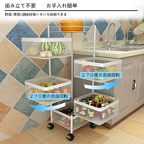 【自由に回転ラック】キッチンワゴンは移動、固定に便利なロック付きキャスター採用、360°自由に回転することもでき、方向を柔軟に変更しますので、清掃もやすくなります。各バスケットは270度自由に回転できます。独特なデザインで収納と物を取るのに非常に便利です。調味料、野菜、果物、台所用品、小型家電製品用の1つの棚で収納ができます。
