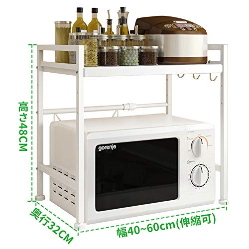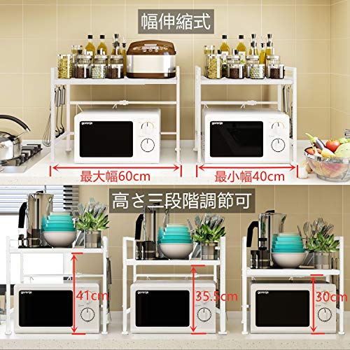 【高さ三段階調節可・幅伸縮式】ラックの高さは30cm、35.5cm、41cmという3段階に調整可能で、更に、幅は収縮式を採用し、40cm~60 cmの間で無段階にご調節でき、使い勝手が良いです。トースター等の小家電、調味用品、キッチン用品をまとめて収納でき、省スペースで、主婦さん、一人暮らしの方にお薦めします