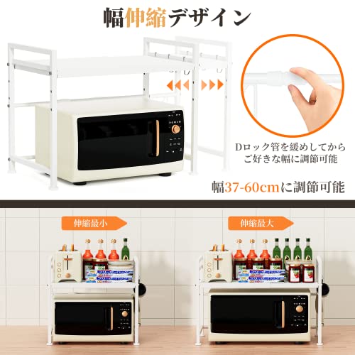 BESONTキッチンラック レンジ台 幅伸縮可(37~60cm)高さ3段調節可 三つフック付き (ホワイトM)