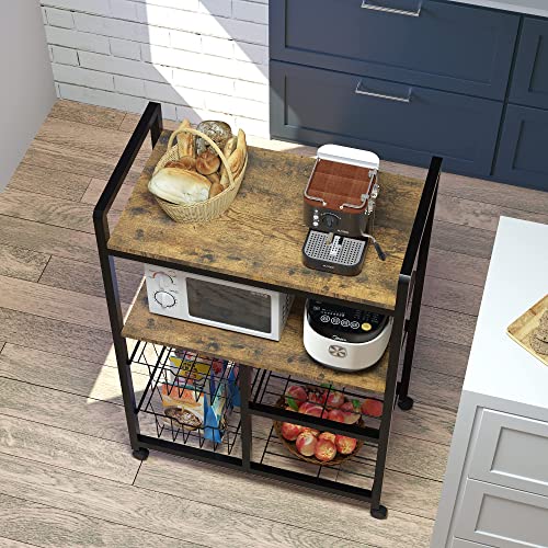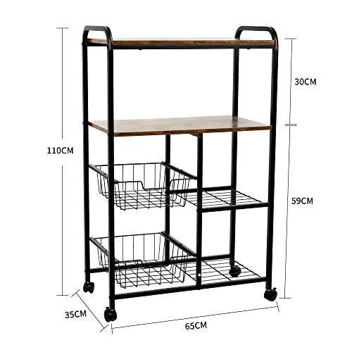 【豊富な収納スペース】サイズ:幅(65)×奥行き(35)×高さ(110)cm。 天板は耐久性に優れ、電子レンジ、ストーブ、やかんなどの厨房機器の収納に最適です。左側の2つの引き出し式バスケットには、散らばりやすい調味料、食品、食器を収納できます!