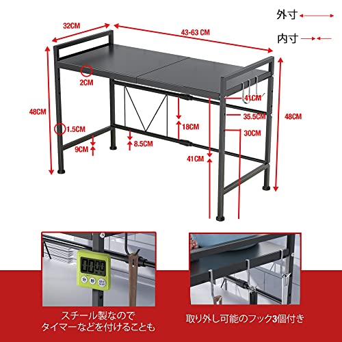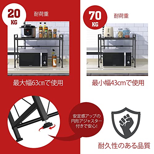 レンジ上ラック 伸縮式 2段 ブラック 幅 43~63 棚板高さ31~41 調節可 キッチンペーパーホルダー付き