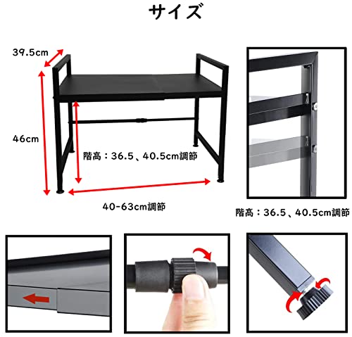 【幅伸縮式・2段式】ラックの高さは36.5cm、40.5cmの2段階に調整可能で、更に、収縮式を採用したため、幅は40cm~63 cmの間で無段階にご調節でき、各サイズの電子レンジやオーブン等の小家電に適用し、キッチン用品をまとめて収納でき、省スペースです。