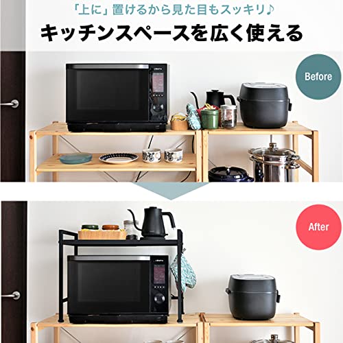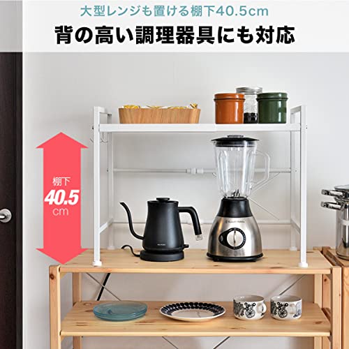 ?【「上に」置けて見た目スッキリ♪】 レンジ横などに置いていたケトルや小物たち。このラックがあればレンジの上に置けるので、キッチンスペースに余裕が生まれます。 ?【背の高い調理器具にも対応】 棚の高さは3段階調節することができます。棚下の高さは最大で(約)40.5cmにできるので、大型レンジや背の高い調理器具などを収納することができます。