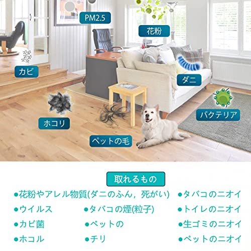 取れるもの:花粉やアレル物質(ダニのフン・死骸)/ウイルス/カビ菌/ホコリ・チリ/タバコの煙(粒子)/ペットの毛/タバコのにおい/トイレのにおい/生ゴミのにおい/ペットのにおい。