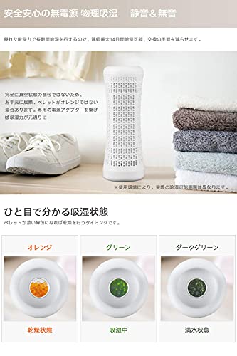 【電源がなくてもどこでも使用可能】直径約7cmの細身設計で狭いスペースに設置可能。 従来の除湿機を設置しても、狭い場所でも使用できます。 除湿時に電力を消費しない無線タイプ。 いつでもご利用いただけます。 ワイヤーに足をぶら下げる心配はありません。 子供やペットの手の届かないところに置くことができます。 とても安全です。 ワードローブや靴棚などの狭いスペースだけでなく、空気が溜まりやすい車内の除湿にも適しています。 360°オールラウンドな吸湿性で、平均除湿面積は通常の除湿ボックスの2倍です。 各マシンは110ml、3スタックのスペースを使用できます。 湿気によるニオイやカビの発生を防ぎ、梅雨時の湿気にも簡単に対応できるよう、隅々まで吸着!