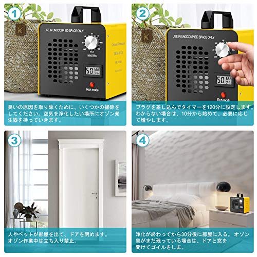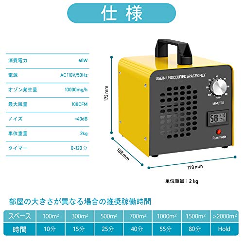 最大120分間で自動的にオフするタイマーを内蔵しており、スイッチを入れて部屋を出れば設定時間後には消臭が完了しています。 この消臭器は、密閉された空間でのみ使用可能で消臭動作中、人は部屋には入らないでください。 ペットなどの動物も同様に入れません。