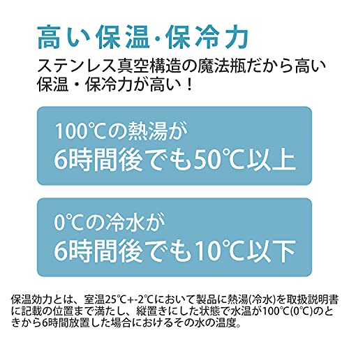 ※保温効果とは、室温25度において、製品に熱湯をせん下端まで満たし、縦置きにした状態で湯温が100度のときから6時間放置した場合における湯の温度です。【保冷効果】:(6時間):10[度]以下