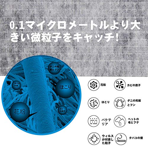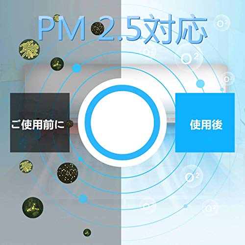 【高性能】エアコンフィルターが花粉、アレルギー物質など目に見えない粒子をキャッチします。また、ウィルスなどが付着している微粒子、ダニの死骸、ペットの毛、カビの胞子などをキャッチします。ハイグレードフィルターで除去できる微粒子に加え、ウィルスが付着した微粒子やたばこの煙(