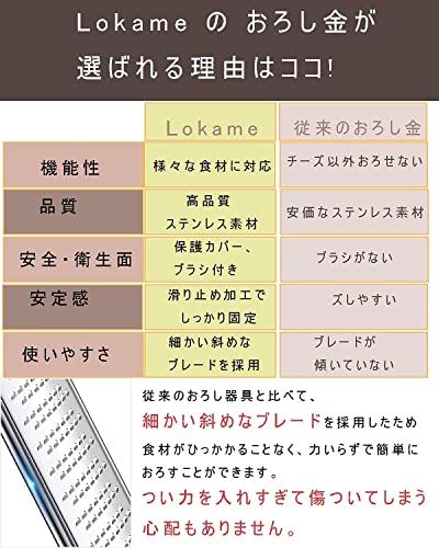 【使いやすいデザイン】使いやすさを追求し、刃の形状と角度のデザインをとことん拘って作り上げました。従来のおろし器具と比べて、細かい斜めなブレードを採用したため食材がひっかかることなく、力いらずで簡単におろすことができます。つい力を入れすぎて傷ついてしまう心配もありません