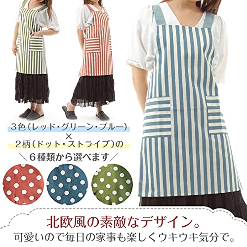 軽くて乾きやすく、シワになりにくい、北欧風 H型 エプロンです。シンプルで可愛いシルエットのエプロンは、ドット柄とストライプ柄の2種類。色は、レッド、グリーン、ブルーの3色から選べます。明るい柄なので、毎日の家事が楽しくできます。また、軽い上に、後ろ姿もすっきり見えるH型だから、首への負担も少なく、肩こりにお困りの方にもおすすめです。