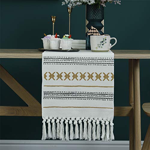 ベージュ幾何学模様のテーブルランナー手づくりタッセル結び目付きテーブルマット編み物ナイトテーブルジ
