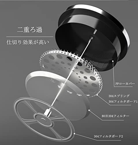 「デザインと性能」目盛りもついており、コーヒーはどの程度いれましたかはっきり見ることが出来ます。防錆、清掃が簡単で、直接濯ぎもしくは水で浸してもよく、プレスを分解することもでき、洗浄はよりきれいで、乾燥後に再利用することができます。