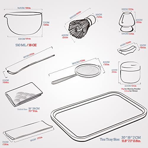 ?プレミアムマチャタセレモニーセット。 10 ピース/セット、含まれるもの: 1 竹泡立て器、1 竹茶トレイ、1 竹スクープ (茶ash)、1 セラミック ボウル (茶wan) 510 ml/18 オンス、1 セルミック泡立て器ホルダー。セラミック スクープ スタンド 1 個、コットン ティー クロス (茶巾) 1 個、ティー クロス ベース 1 個、抹茶パウダー シフター 1 個、セラミック ティー キャニスター 1 個 (抹茶粉末の場合は 18 グラム)。抹茶をライフスタイルに取り入れやすいキットです。