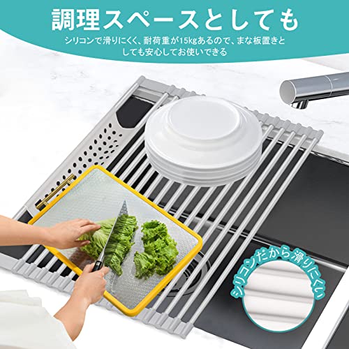 シンクスペースを有効活用:シンク上に水切りラックを置くと、調理台スペースが広くなります。耐荷重15kg?滑りにくいシリコン素材のため、2名~3名分のお皿やカトラリーなど大容量のものを置いても安定?安心です。まな板置きとしてもしっかり支えてくれるので、バランスを気にせず使用することができます。