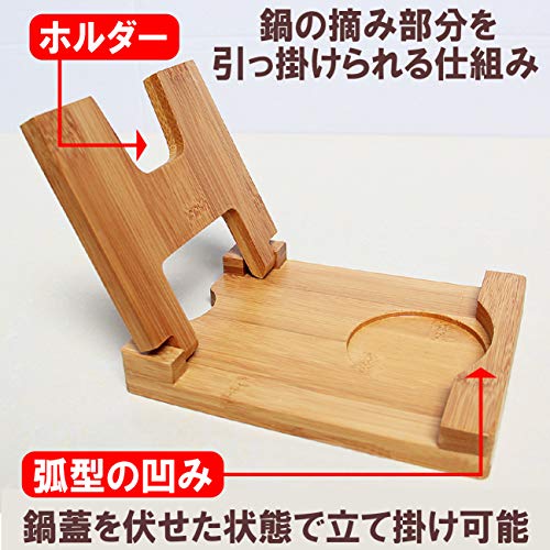 お料理の際に置く場所に困る鍋やフライパンの蓋を立て掛けられる竹製の鍋蓋スタンドです。鍋料理を盛り付けする際にこの鍋蓋スタンドを使えば、蓋を作業場に直接置かなくて済み、清潔な状態で再び蓋を閉められます。
