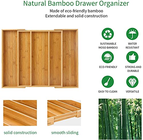 スライド式カトラリーケースのサイズが(幅33-55)x長さ43x高さ5cm。ケースが5つの空間を仕切り、収納力が高いです。引き出しと卓上をきれいにします。