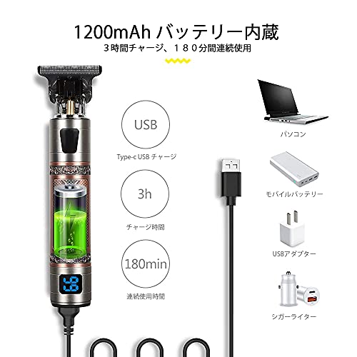 「LEDディスプレイ・レリーフ&金属デザイン」スタイリッシュなフル金属デザインで、おしゃれ。レリーフ模様のデザインで夏に汗が多い時も滑りにくく、自由にヘアーカットを楽しめます。アルミニウム合金で作られたので、防水性がよし。ただし、バリカンを長時間に水に浸さないでください。LEDディスプレイが付いており、バッテリー残量はパッチリ。使用前に、バッテリー残量を確認したら安心できます