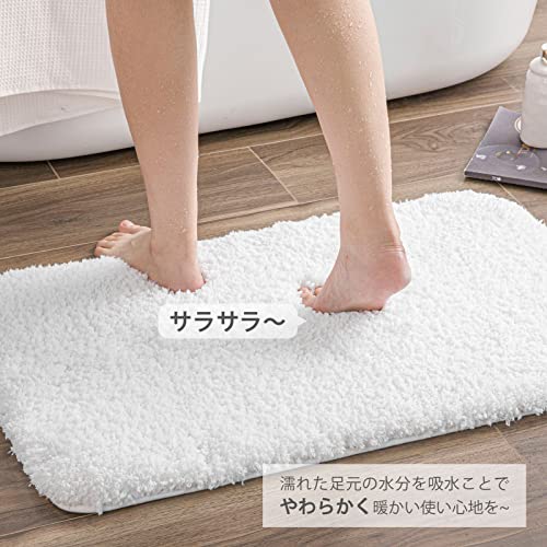 【吸水性・速乾性抜群】吸水性・速乾性に優れたマイクロファイバーを採用していて、繊維は一本で数吸水穴があり、より効率的に大容量の吸水が可能です。濃密な絨毛と約40センチ厚さで目付け2.2キロ/m2で、お風呂上がりの水分をすぐに吸い取り、優しい触感で足の裏も癒されます。速乾性にすぐれているので、何人かお風呂に入った後でもサラサラの使い心地で、ふんわりの感触をキープし、最後の人までぺたぺたならなく、気持ちよくお使いいただけます。