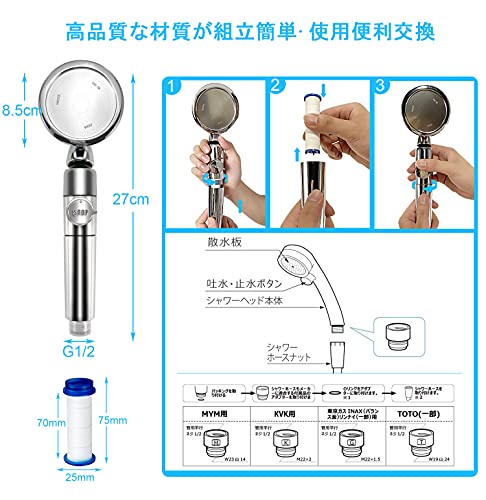「2021最新人気版?業界新登場」シャワーヘッド 節水 塩素除去80% 止水ボタン 高水圧 360°角度回転 取り付け簡